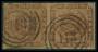 1858. 4 sk. brun i par, højre mærke med brud på øvre venstre posthornsfelt.