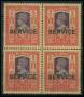 BURMA. Tjeneste. 1939. 5 r. violet/scarlet i 4-blok, brunlig lim. SG 104 £