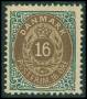 1875. 16 øre grå/brun med variant: Farveløs plet over D i Danmark.