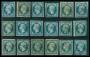 1852. 25 c. blå. Planche med 18 stk. i blandet kvalitet. AFA 7200,-