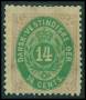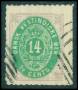 1876. 14 c. lilla/grøn med 5-rings stp. nogle korte takker. AFA 13000,-