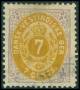 1873. 7 c. lilla/gul med lang gul farvespies i syd. AFA 1100,-+