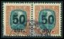 1925. 50 a/5 kr. brun/gråblå i par med plet i 0 i venstre mærke. AFA 800,-+