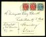 1875. 4 øre grå/blå x 3og 8 øre grå/rød på brev til USA, småfejl.