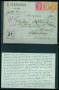 1888. Adressekort, privat fremstillet, for en pakke på 5 Pund sendt fra Københavns Banegaard 19.3.1888 til Vemb-Lemvig Jernbane. Sendt ufrankeret og opkrævet 32 øre. Desuden er der opkrævet 2 øre (blå...