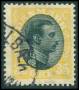 1918. 35 øre gul/sort med variant: Diagonal streg foran hals.