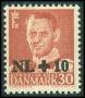1953. 30+10 øre rød med variant: Vandret korsarme afskåret foroven.