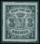 BREMEN. 3 sort/blå stukken kant, vandret stribet papir. AFA 12000,-