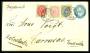 1873. Tofarvet, 1 Cent, 4. Tryk og 3 Cents, 5. Tryk, samt 4 Cents, 2. Tryk. Opfrankeret på helsagskonvolut, 2 Cents, blå. I alt 10 cents på brev sendt fra ST. THOMAS 27.7.1886 til Poste Restante i Car...