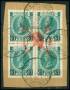 1916. 20/14 k. blågrøn i 4-blok med propaganda tiltryk fra 1. verdenskrig på klip. Sjælden.
