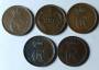 Christian IX (1863-1906). 1-Øre 1875, 1880, 1882, 1883, 1888. 5 stk. DNF 1.1.