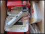 Kasse med diverse mærker og noget tilbehør.