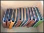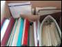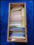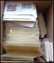 Flyttekasse med anderledes rodet kartotek på A5 plancher samt marginalblokke. Endvidere tilbehør-klemlommer m.m.