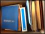 TILBEHØR. Flyttekasse med album og nye indstiksbøger og noget litteratur.