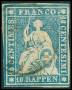1855. 10 rp. blå, rød tråd med dobbelttryk af bogstaverne i den øvre halvdel, sjælden.
